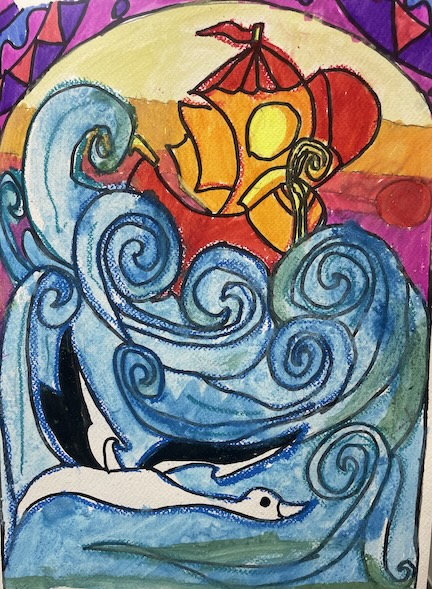 Our original picture is a batik done by a theatre student at the Artistic Theatrical College of Odessa, Ukraine. It shows both a ship and an albatross. The waves, the ship, and the albatross are linked into one energetic scene!