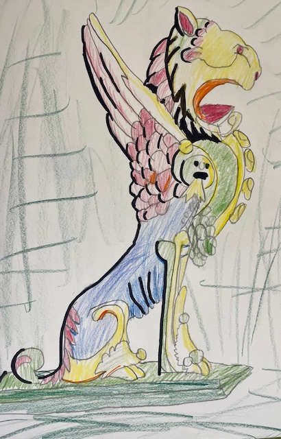 The original opinicus uses gold paint to enhance the 3-dimensionality of the sculpture. We will use three values of one color—light, medium, and dark—to give dimension to our drawing. Then we will dress it with a gold paint pen.
