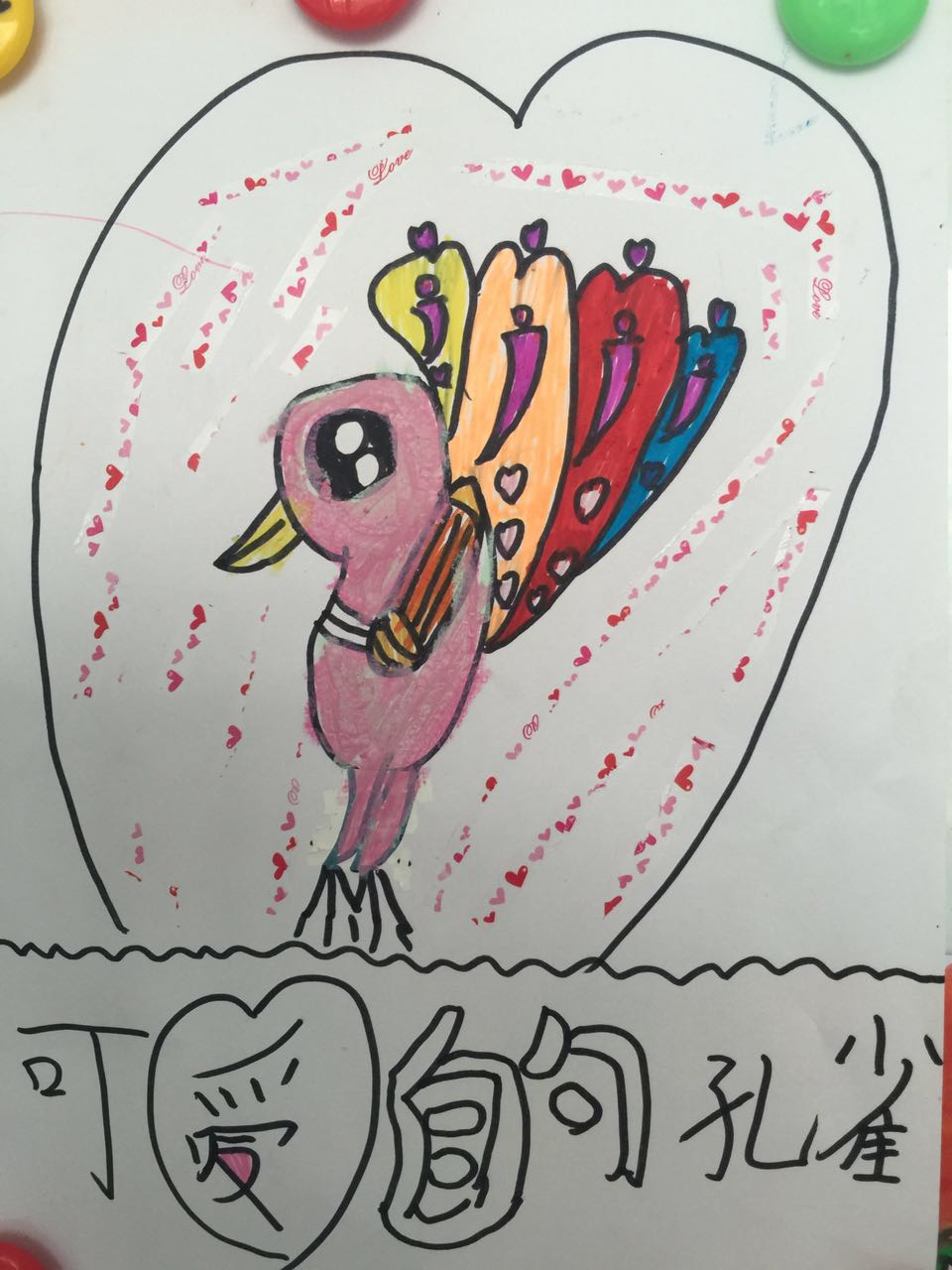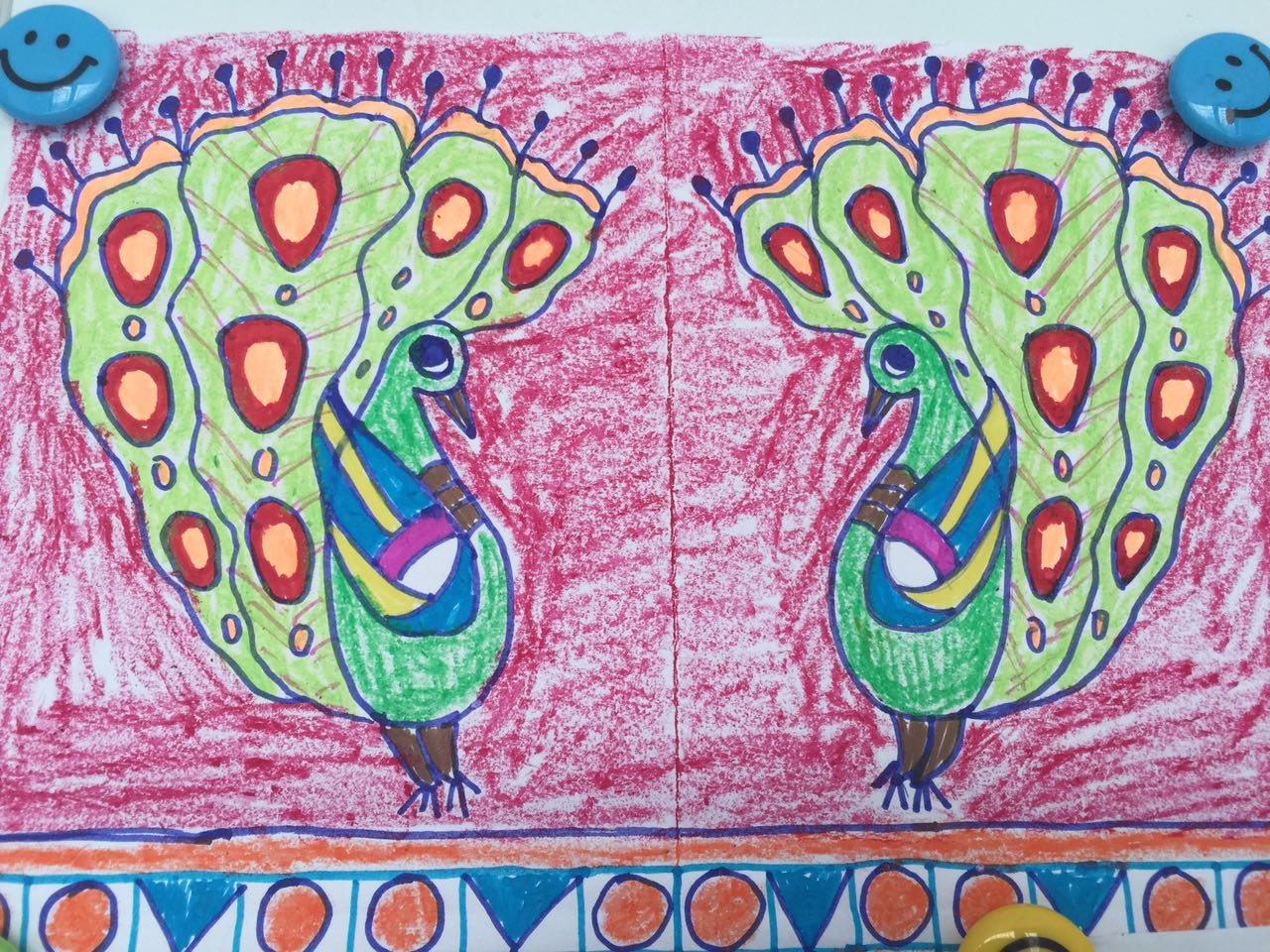 While an adult chose to use crayons, and to experiment with scale and color contrast