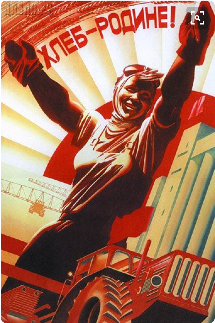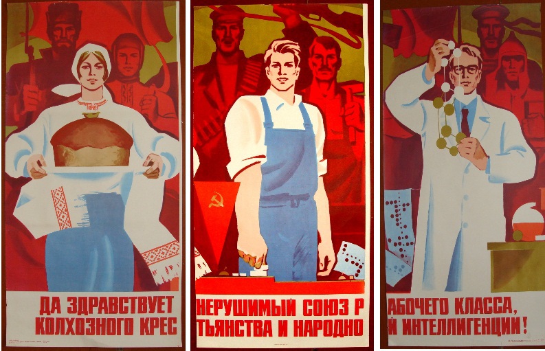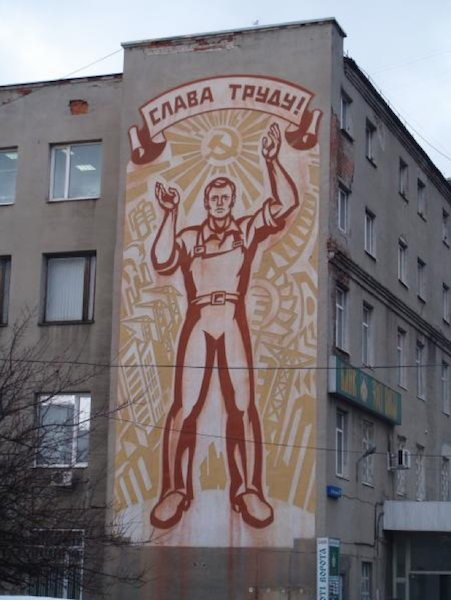 The story used a new art form that glorified workers, those heroes of the new narrative. One could find this art on walls and monuments in cities across the Soviet empire. On building after building, were pictures with the words,